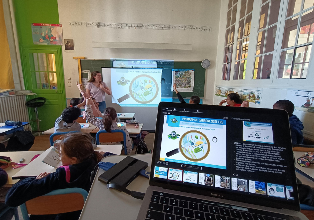 Pour la classe de CM1, c’est le 4ème atelier . Mme Levy, enseignante, mène un projet sur l’écologie. A l’arrivée de Clara, la séquence en cours s’arrête et les élèves sortent sur leurs bureaux le carnet d’enquêteur Carbone Scol’ERE.