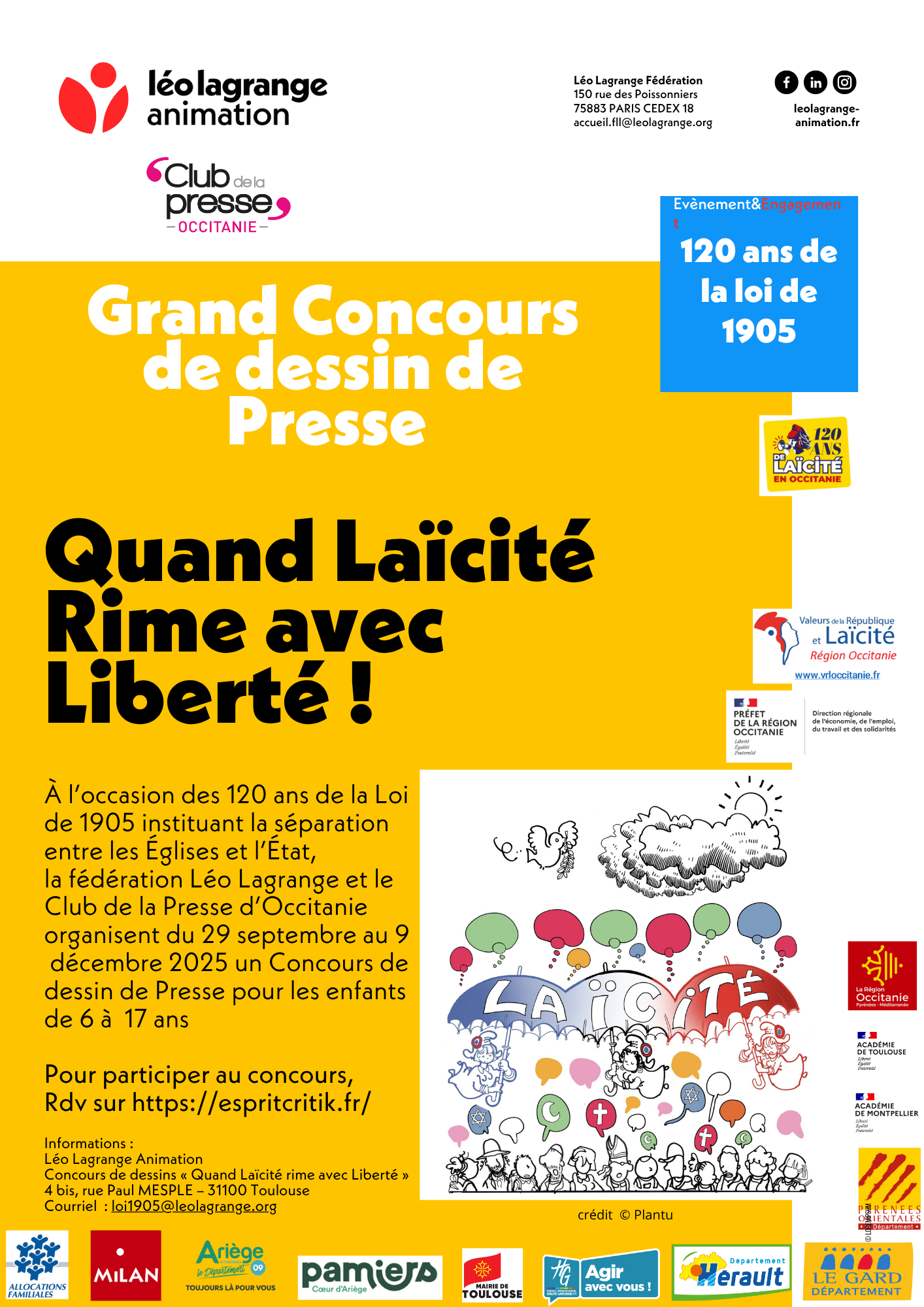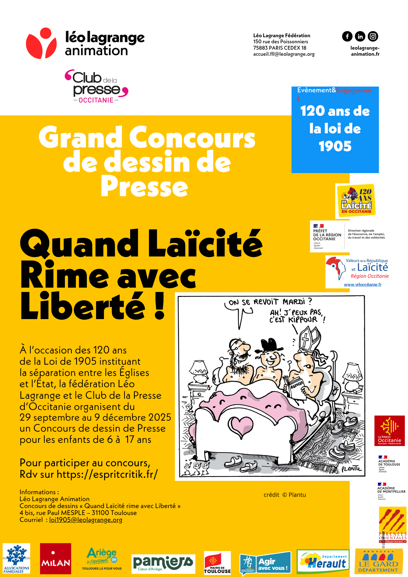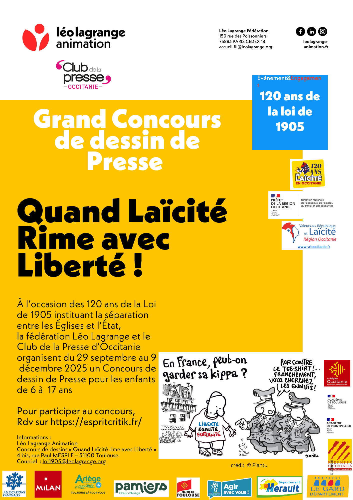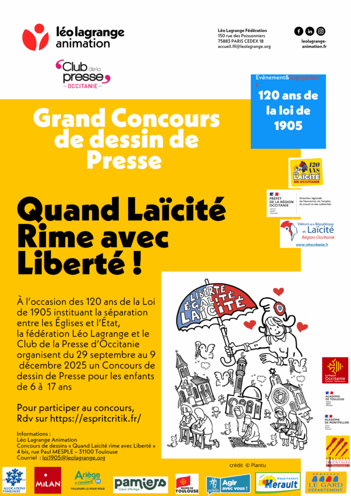 À l’occasion des 120 ans de la loi de 1905, Léo Lagrange Animation et le Club de la presse Occitanie lancent un grand concours de dessin de presse, ouvert aux enfants et adolescents de 6 à 18 ans. Objectif : sensibiliser les jeunes à la laïcité et à la liberté d’expression à travers le dessin de presse, média accessible et créatif.