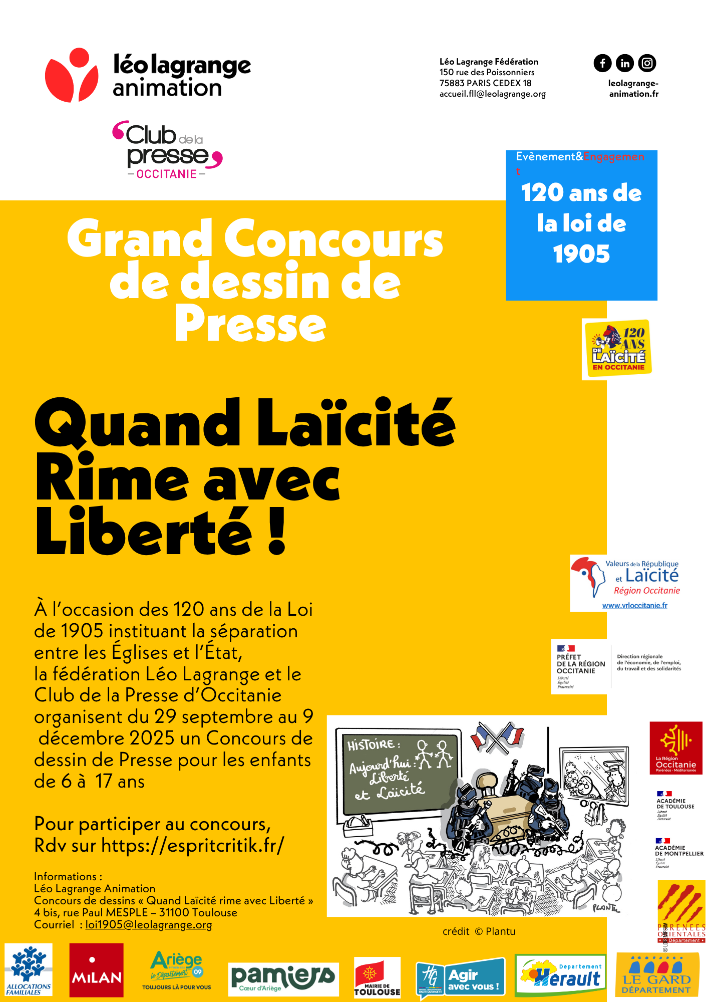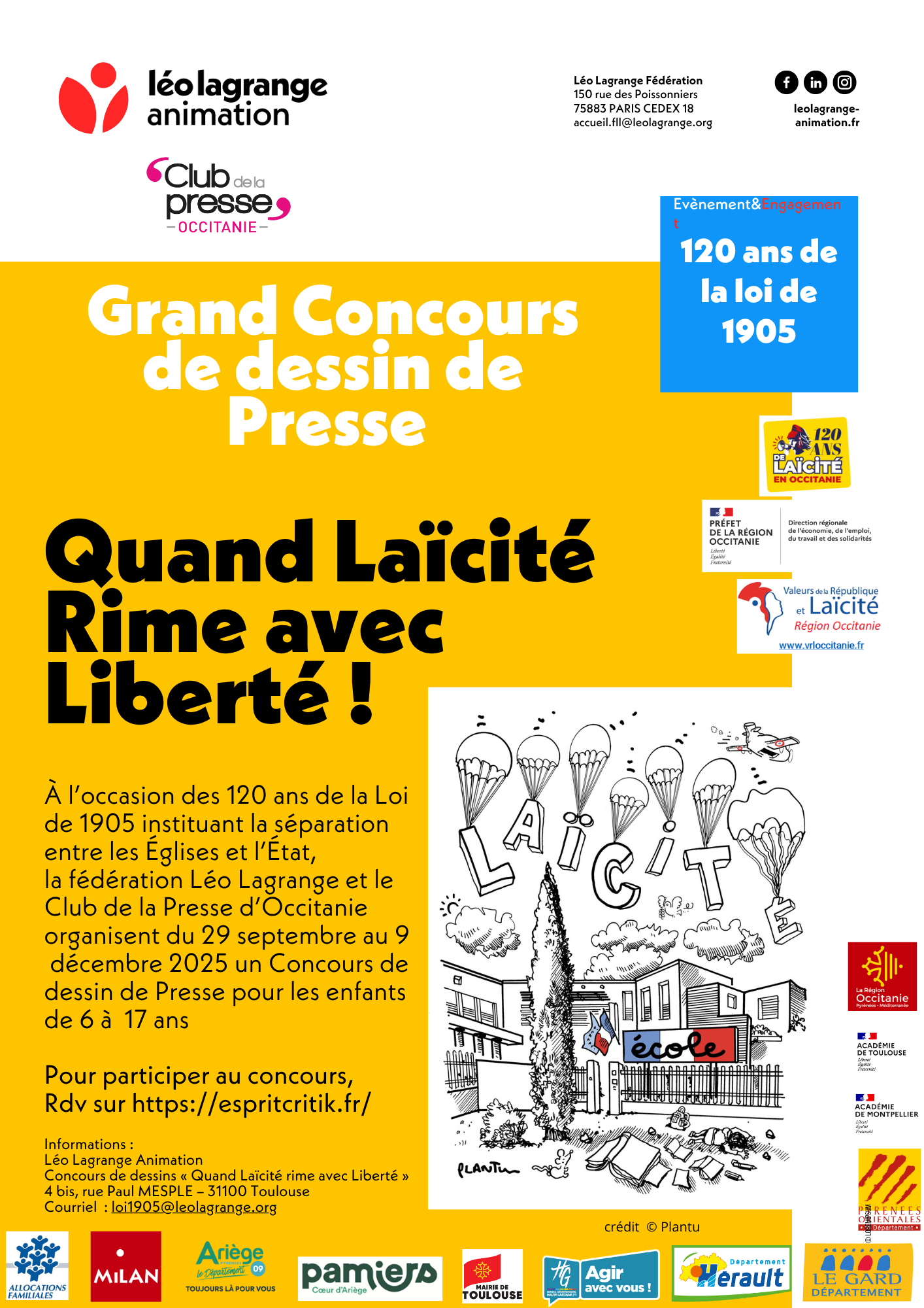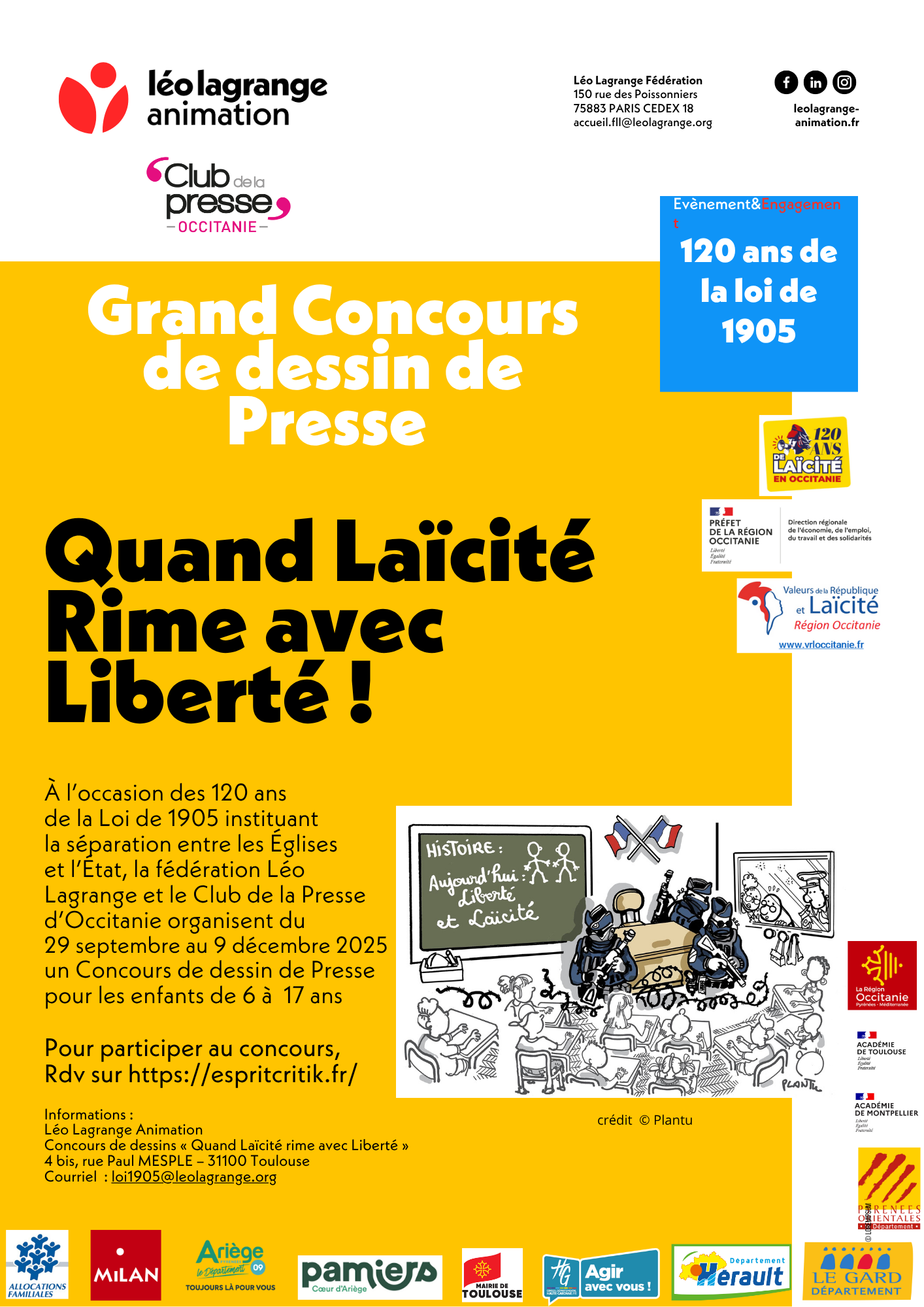 À l’occasion des 120 ans de la loi de 1905, Léo Lagrange Animation et le Club de la presse Occitanie lancent un grand concours de dessin de presse, ouvert aux enfants et adolescents de 6 à 18 ans. Objectif : sensibiliser les jeunes à la laïcité et à la liberté d’expression à travers le dessin de presse, média accessible et créatif.