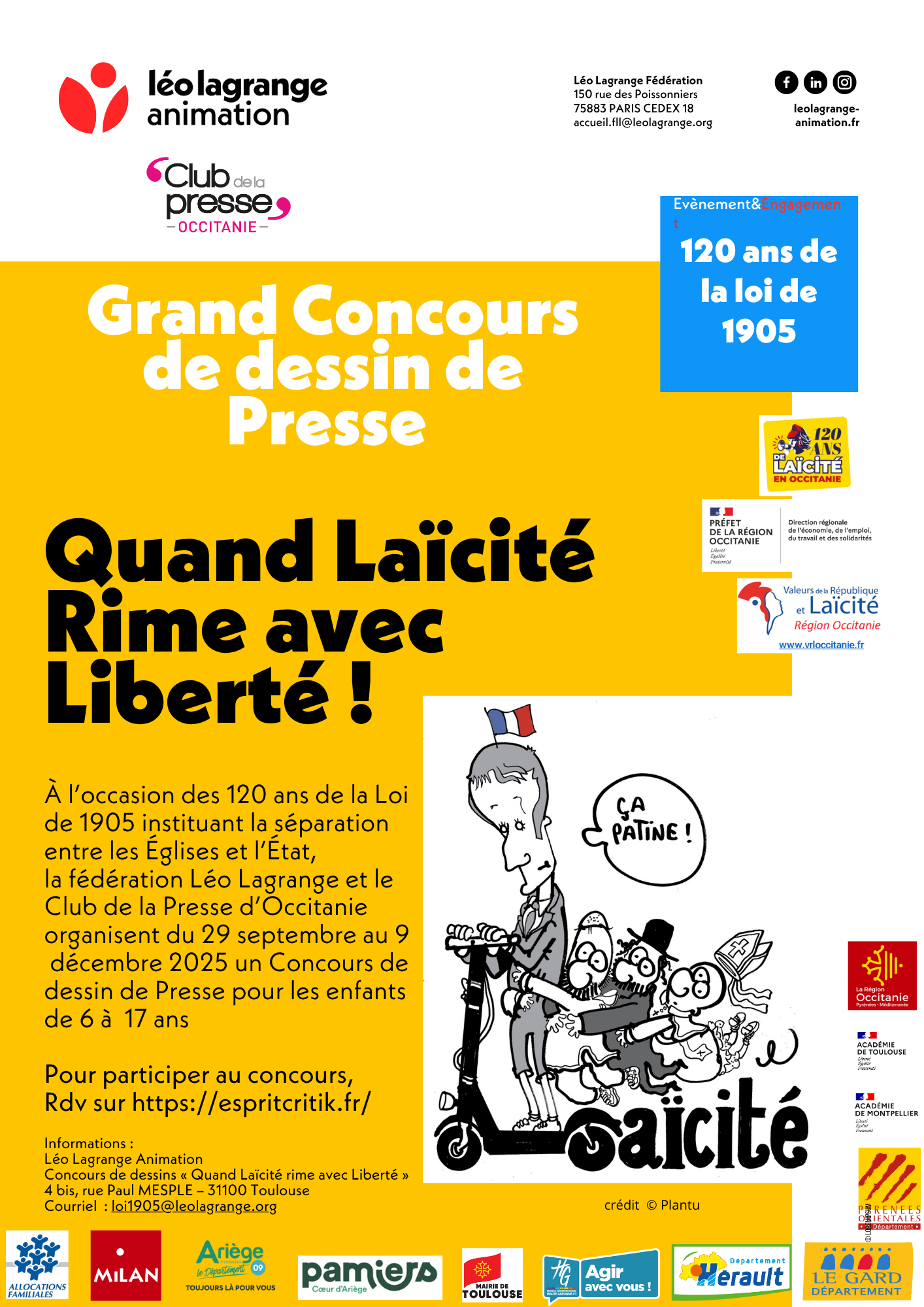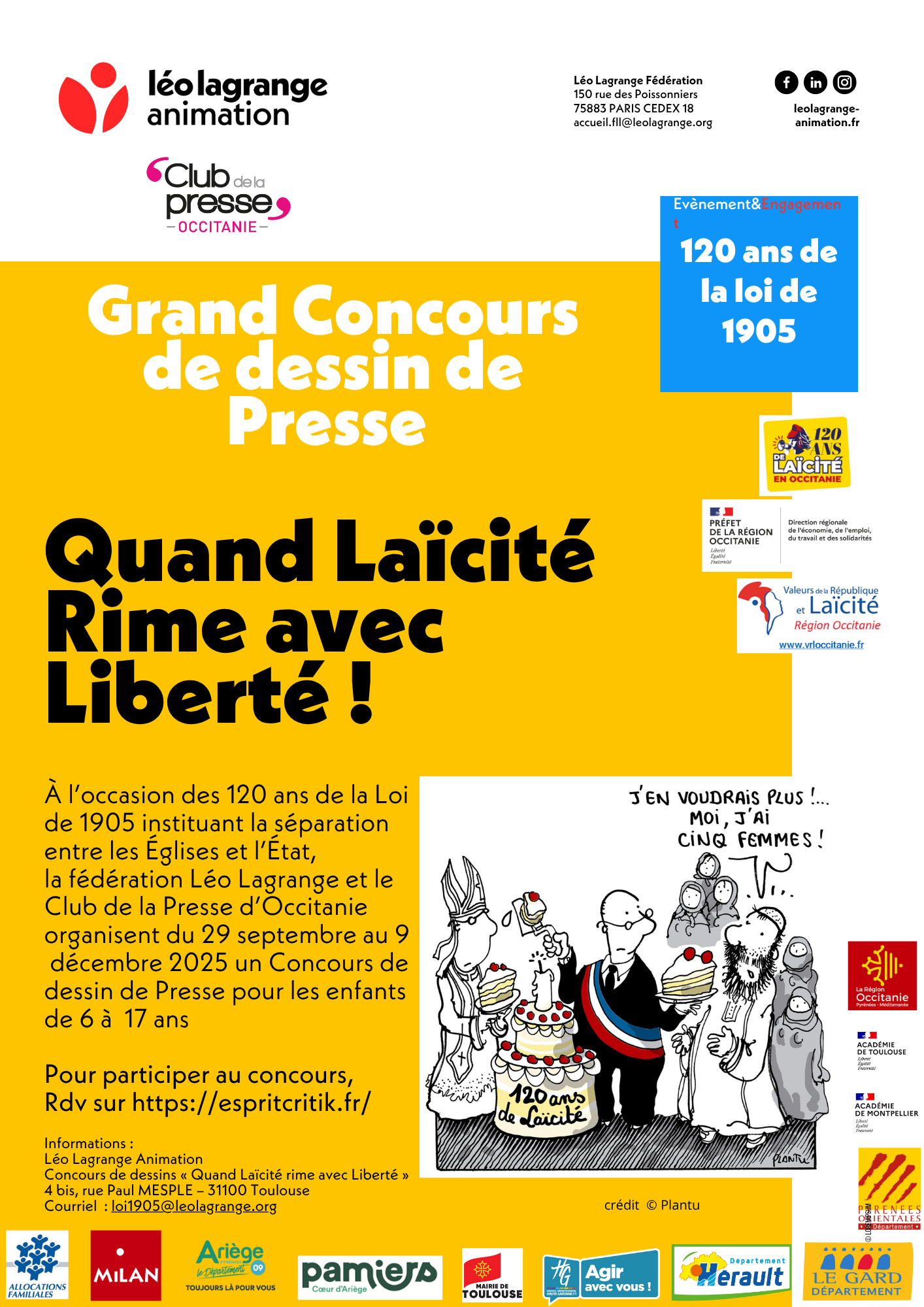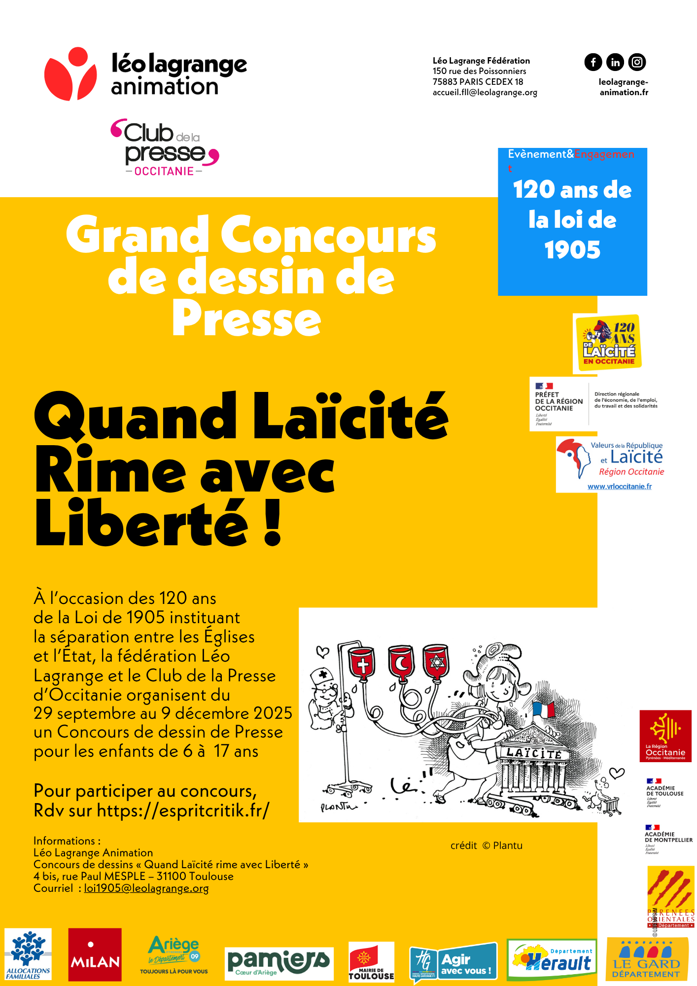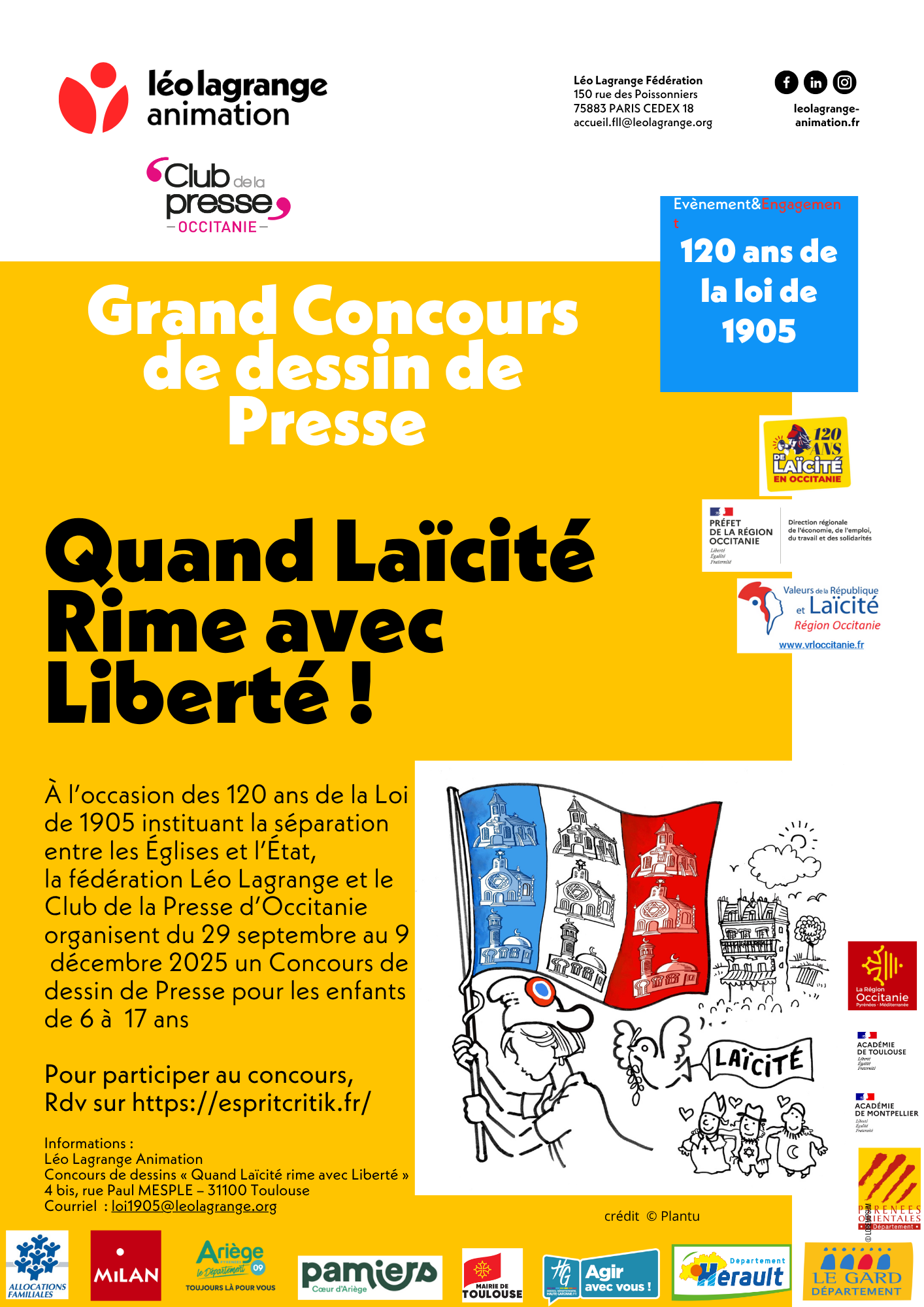 À l’occasion des 120 ans de la loi de 1905, Léo Lagrange Animation et le Club de la presse Occitanie lancent un grand concours de dessin de presse, ouvert aux enfants et adolescents de 6 à 18 ans. Objectif : sensibiliser les jeunes à la laïcité et à la liberté d’expression à travers le dessin de presse, média accessible et créatif.